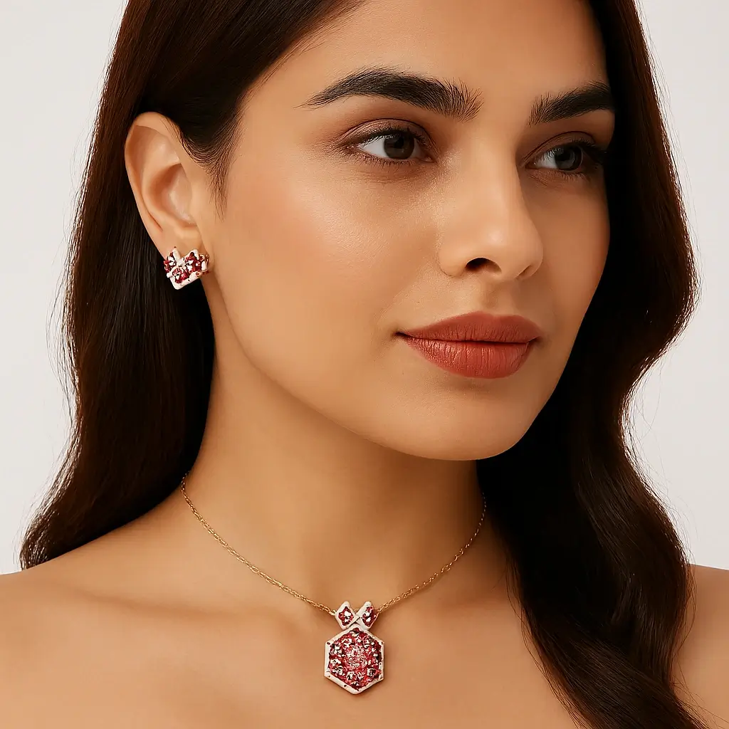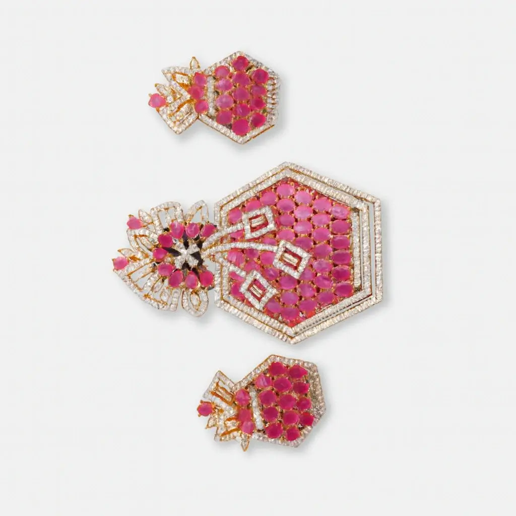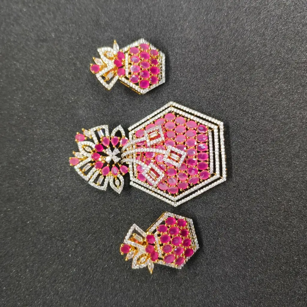 Make a stylish statement with this Designer Hexagon Ruby Pink Pendant Set by Risha Fine Jewels. Featuring a unique hexagon-shaped pendant, the set is highlighted with a rich ruby pink stone that adds vibrant color and sophistication. The geometric design brings a modern edge, while the coordinated earrings complete the look with graceful balance. Perfect for parties, festive occasions, and elegant gatherings, this pendant set pairs beautifully with ethnic, fusion, and contemporary outfits, offering a chic and eye-catching appeal.