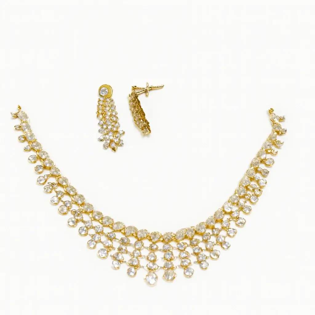 Make a lasting impression with this Elegant Gold-Finish Statement Necklace Set by Risha Fine Jewels. Crafted to reflect classic luxury, the set features a rich gold finish that enhances its bold yet graceful design. Perfect for weddings, receptions, and grand celebrations, this necklace set complements bridal lehengas, sarees, and couture ensembles with effortless elegance. The coordinated elements create a striking silhouette that adds depth, shine, and a regal touch, making it an essential piece for special occasions and celebratory moments.