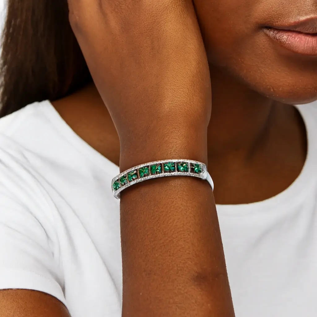 The Elegant Silver-Plated Emerald Stone Bracelet with Diamond-Style Accents by Risha Fine Jewels is designed to reflect refined luxury and graceful charm. The vibrant emerald stone forms a striking centerpiece, beautifully complemented by diamond-style accents that add subtle brilliance. Finished in a polished silver-plated tone, this bracelet offers a classic yet contemporary appeal. Ideal for parties, weddings, festive occasions, and formal gatherings, it pairs effortlessly with both ethnic and modern outfits. Lightweight and comfortable for extended wear, this bracelet makes a sophisticated statement while maintaining everyday elegance.