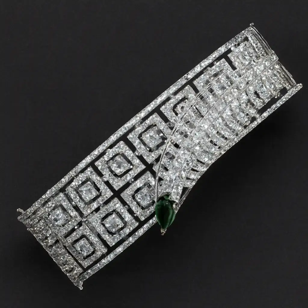 A stunning emerald-green teardrop stone forms the highlight of the design, adding a regal touch that enhances the bracelet’s overall charm. Finished in high-quality white-gold plating, this statement piece delivers an opulent shine while maintaining long-lasting durability and comfort.