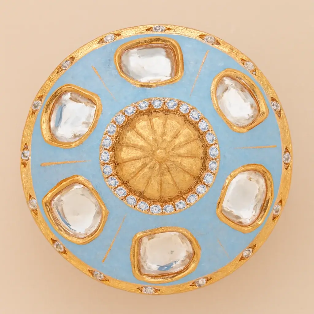 This eye-catching statement ring showcases a beautiful sky-blue Meenakari enamel base, meticulously hand-painted to create a smooth, vibrant finish. Surrounding the ring are premium, mirror-polished Kundan stones, set in an elegant circular pattern that enhances the richness of the design. At the center sits a gold-toned embossed dome, bordered with shimmering micro-CZ diamonds that add a touch of modern sparkle to this traditional masterpiece.