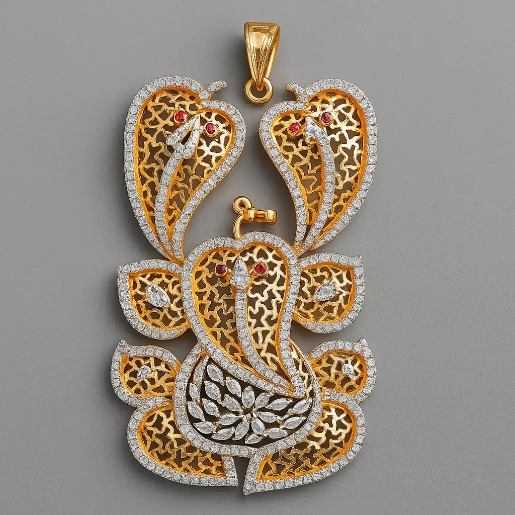 Discover divine elegance with this Luxury Gold-Plated Lord Ganesha Pendant by Risha Fine Jewels. Designed with intricate filigree craftsmanship, sparkling CZ diamonds, and premium gold plating, this pendant brings together spirituality and style. A perfect choice for festive wear, daily devotion, gifting, or making a bold ethnic fashion statement.