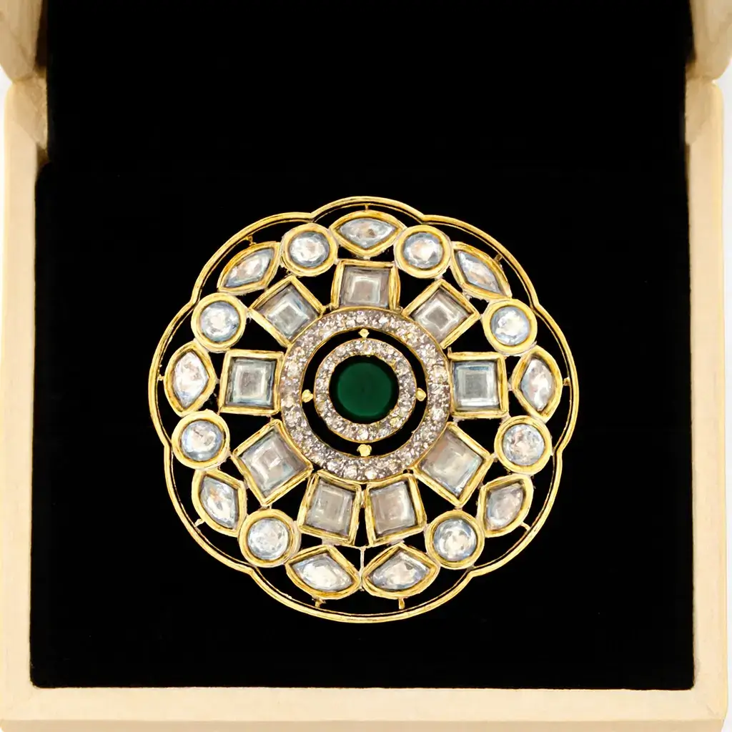 Elevate your festive and bridal wardrobe with the Royal Kundan Floral Brooch with Emerald-Green Center Stone from Risha Fine Jewels—a masterpiece inspired by traditional Indian craftsmanship. Designed in a grand floral motif, this statement brooch features premium gold plating, high-clarity kundan-style CZ stones, and a captivating emerald-green center gem that brings richness and grace to any ensemble.