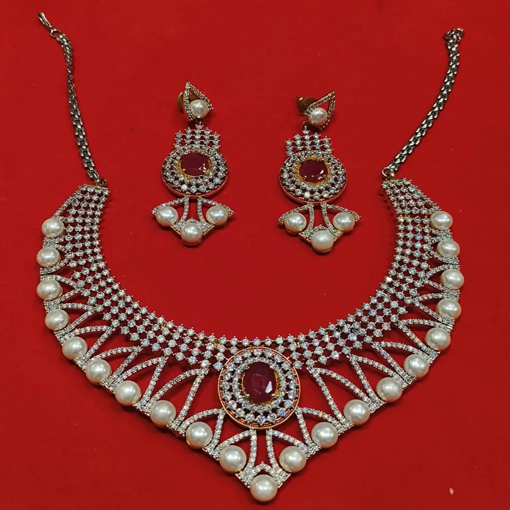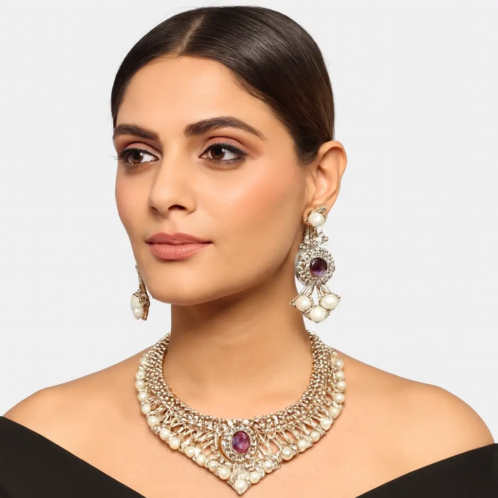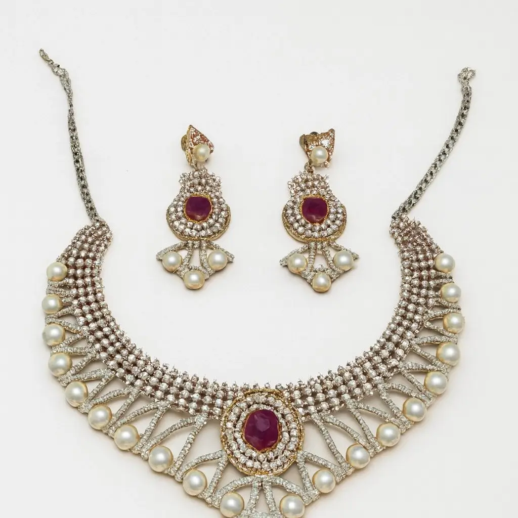Celebrate grandeur and elegance with this Royal Wedding Necklace Earring Set by Risha Fine Jewels. Expertly crafted with radiant red stones symbolizing tradition and prosperity, the set is beautifully enhanced with shimmering CZ diamonds that add exceptional brilliance. The regal design reflects classic wedding aesthetics with a luxurious finish, making it an ideal choice for brides, receptions, and ceremonial occasions. Whether paired with a bridal lehenga, saree, or couture ensemble, this set delivers an opulent statement that captures attention and elevates every moment.