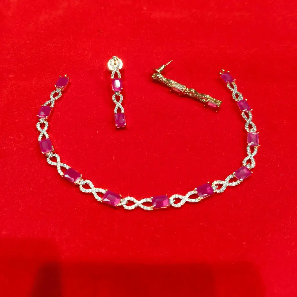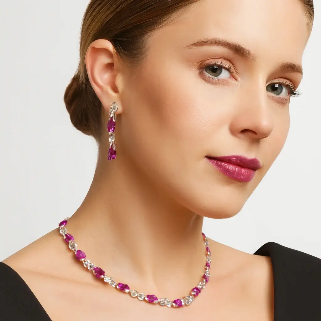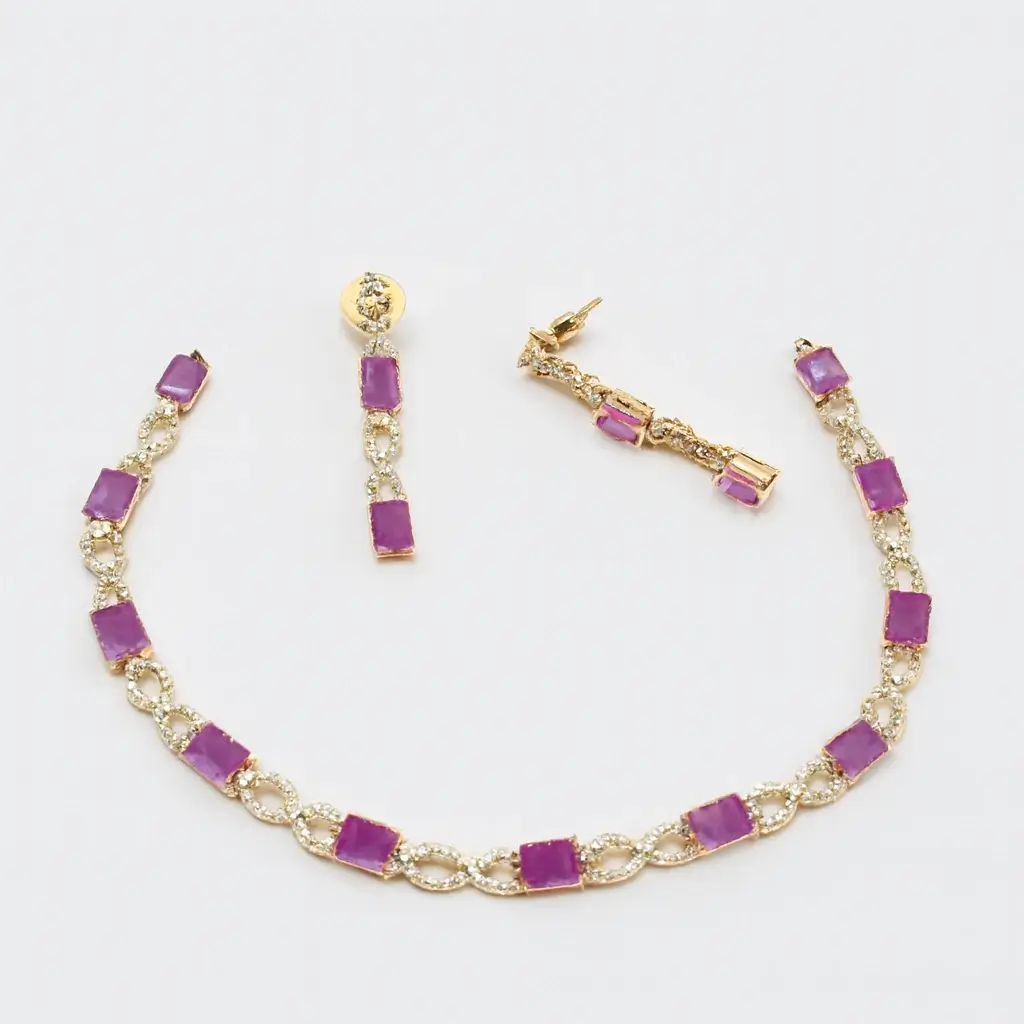 The Statement Gold-Finish Necklace & Earrings Set with Pink Crystal Accents by Risha Fine Jewels blends vibrant color with graceful craftsmanship. Featuring a polished gold-finish base, the necklace is beautifully enhanced with soft pink crystal accents that add charm and sophistication. The matching earrings complete the coordinated look, creating a striking yet balanced ensemble. Perfect for weddings, festive celebrations, parties, and evening events, this set pairs effortlessly with ethnic wear and contemporary outfits alike. Lightweight and comfortable for extended wear, it delivers standout elegance with a touch of modern glamour.