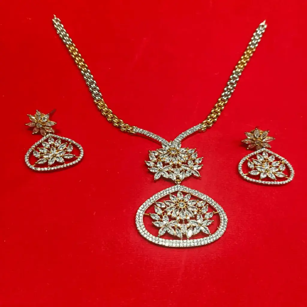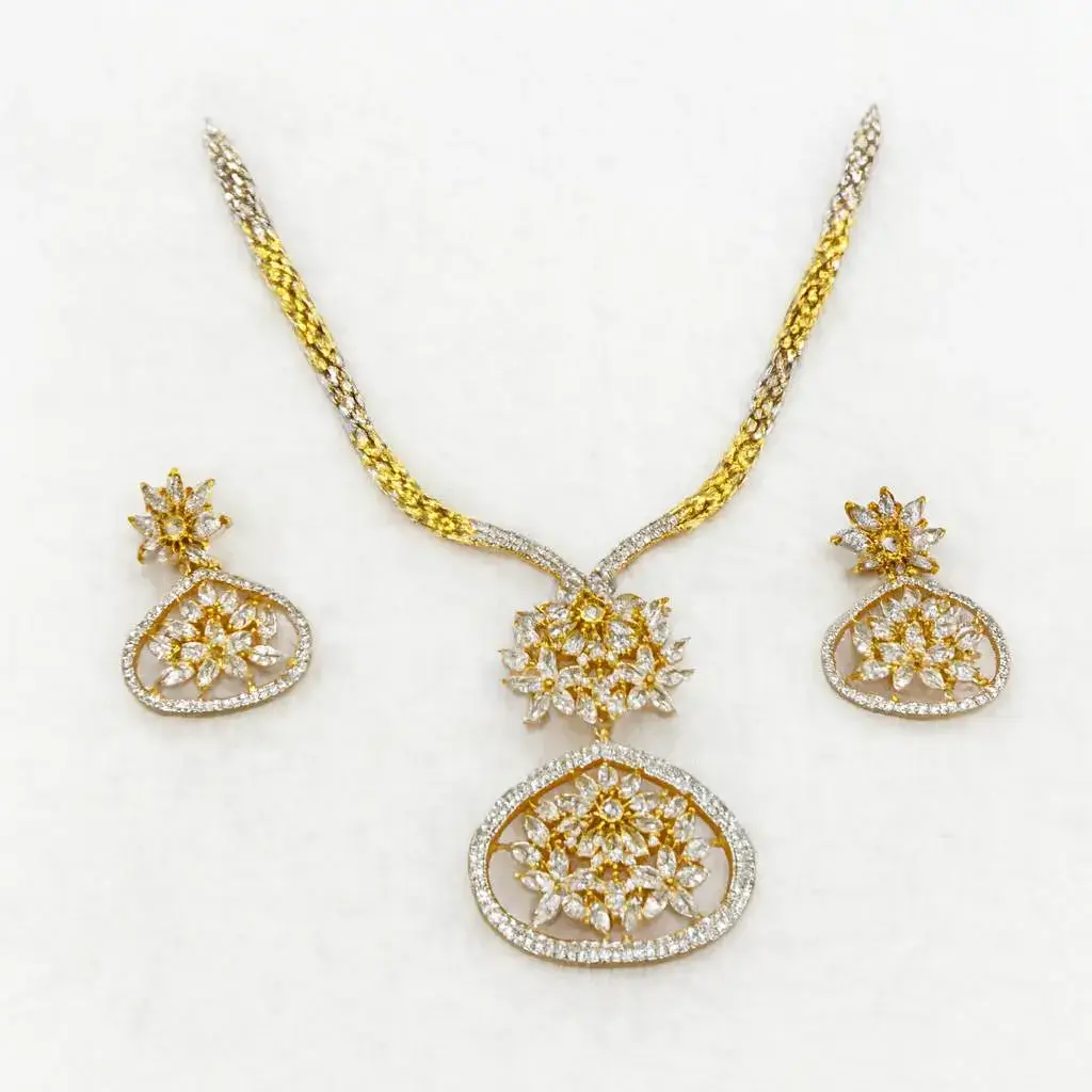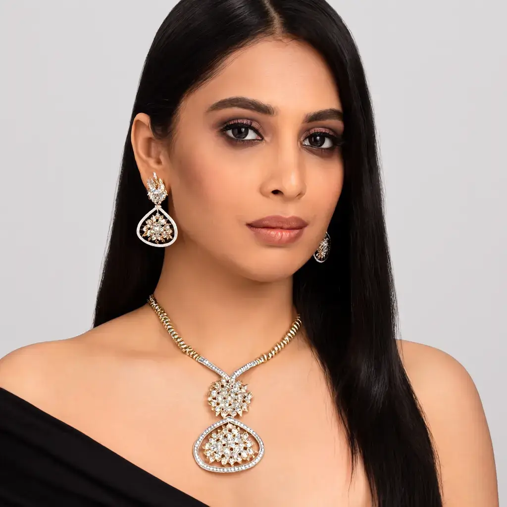 The Statement Gold-Plated Floral Necklace Set with Matching Drop Earrings by Risha Fine Jewels reflects timeless beauty inspired by delicate floral motifs. Crafted with a rich gold-plated finish, the necklace features intricately designed floral elements that add depth and elegance to the overall look. The matching drop earrings complement the necklace perfectly, creating a cohesive and graceful ensemble. Ideal for weddings, festive celebrations, receptions, and parties, this set pairs beautifully with sarees, lehengas, and ethnic-fusion outfits. Lightweight and comfortable, it offers lasting elegance while enhancing your style with refined charm.