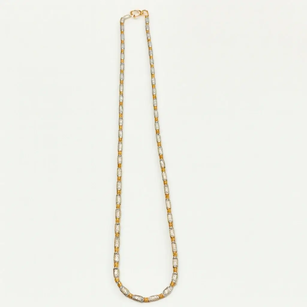 A two-tone cylinder bead mala chain featuring gold and silver finishes, designed as a versatile daily-wear necklace with subtle elegance.